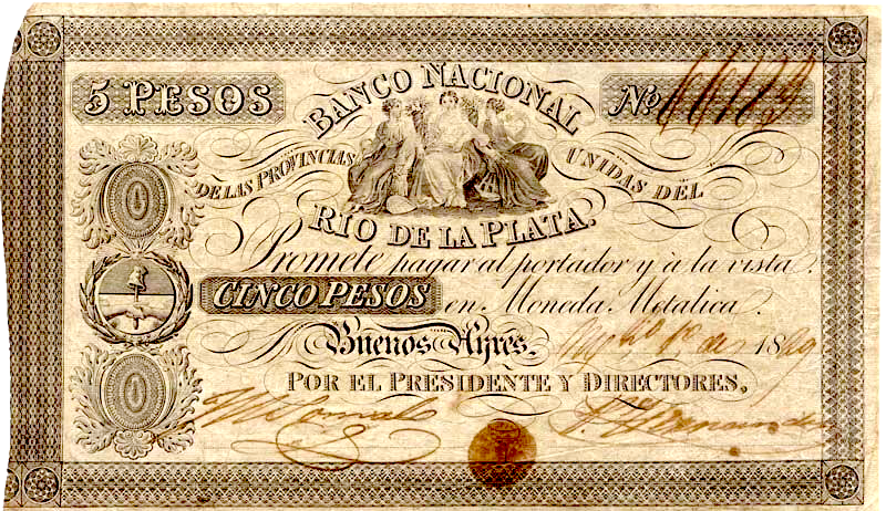 Al igual que con el Banco de Brasil, la guerra provocaría el colapso del Banco de Buenos Aires . En 1826, el banco fue nacionalizado, dado que el gobierno necesitaba la institución para financiar la guerra, renombrándolo como Banco Nacional ; continuó emitiendo moneda, pero ya no convertible. Así comenzó un experimento original que duraría casi treinta años con la circulación de papel moneda sin respaldo metálico. Sin embargo, el Banco Nacional dependía cada vez más del gobierno; en 1827, de los activos del banco, estimados en 15 millones de pesos papel, 11 millones de pesos eran préstamos hechos al gobierno. En 1831, el banco tenía 15 millones de pesos en circulación, pero las deudas del gobierno con la institución ya superaban los 19 millones de pesos papel.